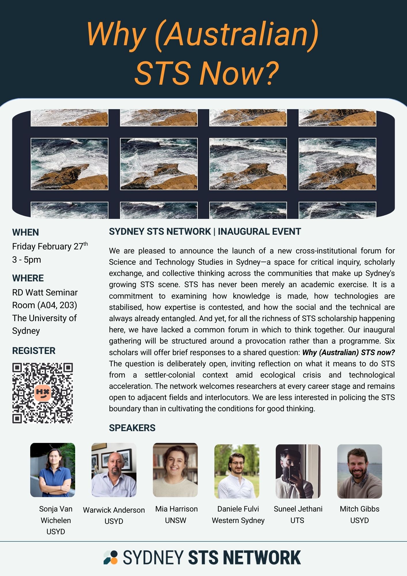 We are pleased to announce the launch of a new cross-institutional forum for Science and Technology Studies in Sydney—a space for critical inquiry, scholarly exchange, and collective thinking across the communities that make up Sydney's growing STS scene. STS has never been merely an academic exercise. It is a commitment to examining how knowledge is made, how technologies are stabilised, how expertise is contested, and how the social and the technical are always already entangled. And yet, for all the richness of STS scholarship happening here, we have lacked a common forum in which to think together. Our inaugural gathering will be structured around a provocation rather than a programme. Six scholars will offer brief responses to a shared question: Why (Australian) STS now? The question is deliberately open, inviting reflection on what it means to do STS from a settler-colonial context amid ecological crisis and technological acceleration. The network welcomes researchers at every career stage and remains open to adjacent fields and interlocutors. We are less interested in policing the STS boundary than in cultivating the conditions for good thinking.